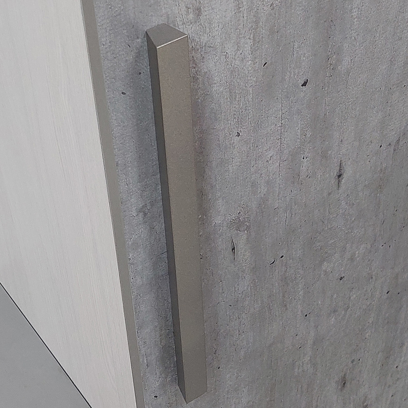 Посудный шкаф со стеклянной дверцей позволит выставить в гостиной те коллекционные и памятные вещицы, которыми вы дорожите. Стеклополки в обработке еврокромкой выдерживают до 10 кг каждая. Их можно декоративно подсветить с помощью светодиодной подсветки (в комплекте не поставляется, приобретается отдельно). Фасад перенавешивается на левую и правую сторону. Серебристая стильная ручка из массива дерева и серое тонирование стекло фасада вносят смелые дизайнерские штрихи в восприятии актуального декора "под бетон".