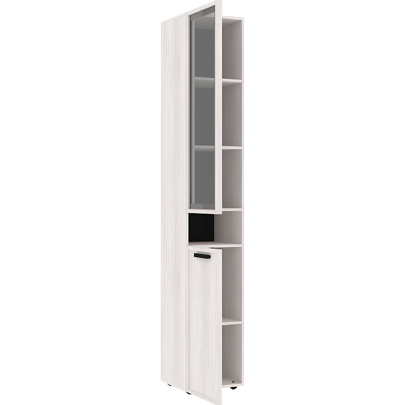 Высокий шкаф для хранения идеально подходит для комнаты подростков, в которой слишком много разнообразных и таких "нужных вещей". Верхний рамочный фасад с тонированным стеклом открывается за раму, нижний фасад Контур открывается за серую ручку из массива. Верхний и нижний фасады можно перенавесить на левую и на правую стороны.