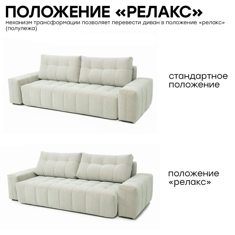 Модульная коллекция «Брайтон» — это сочетание технологий и минимализма. Особенностью коллекции является положение RELAX, которое увеличивает глубину сиденья на 30%. Подушки изготовлены из кокосовой койры — одного из самых экологичных и долговечных материалов. Благодаря своей специальной форме, они идеально подстраиваются под изгибы тела, усиливая эффект от положения RELAX.