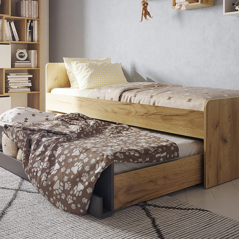 ЛОЙС 80 Кровать выполнена как подростковая кровать-тахта с большим выкатным ящиком на роликах. Изголовье и изножье со скругленными углами облицованы ударопрочной кромкой ПВХ 2 мм, что, безусловно, немаловажно для детей и родителей, выбирающих мебель. Обратите внимание, что изножье совсем не высокое и не будет мешать садиться на кровать даже с этой стороны, поэтому кровать можно ставить не только у стены. Кроватный ящик открывается за ручку-карман. Такой импровизированный карман дает возможность аккуратно сложить необходимые перед сном вещи: книгу, телефон, любимую игрушку. Выдвижной ящик используйте как место для хранения или как дополнительное спальное место. Если планируется дополнительное полноценное спальное место, достаточно не устанавливать делитель при сборке и приобрести матрас.