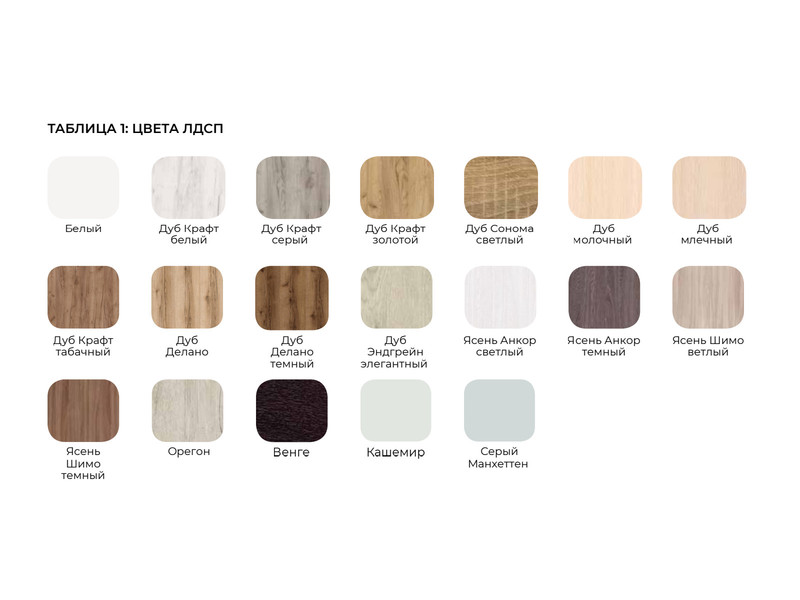 Цвет ЛДСП: Белый, Дуб сонома, Ясень Анкор светлый, Дуб Крафт белый, Дуб Крафт Золотой, Дуб Крафт серый.