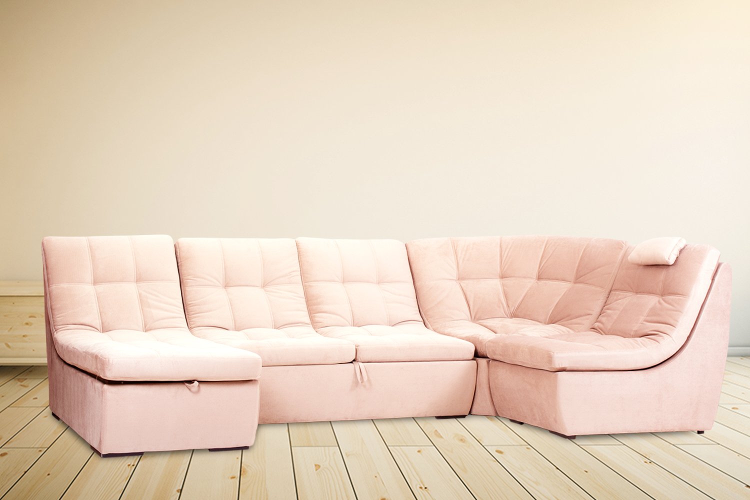Диван модульный состоит из оттоманки, дивана выкатного, угловой и кресельной секций.