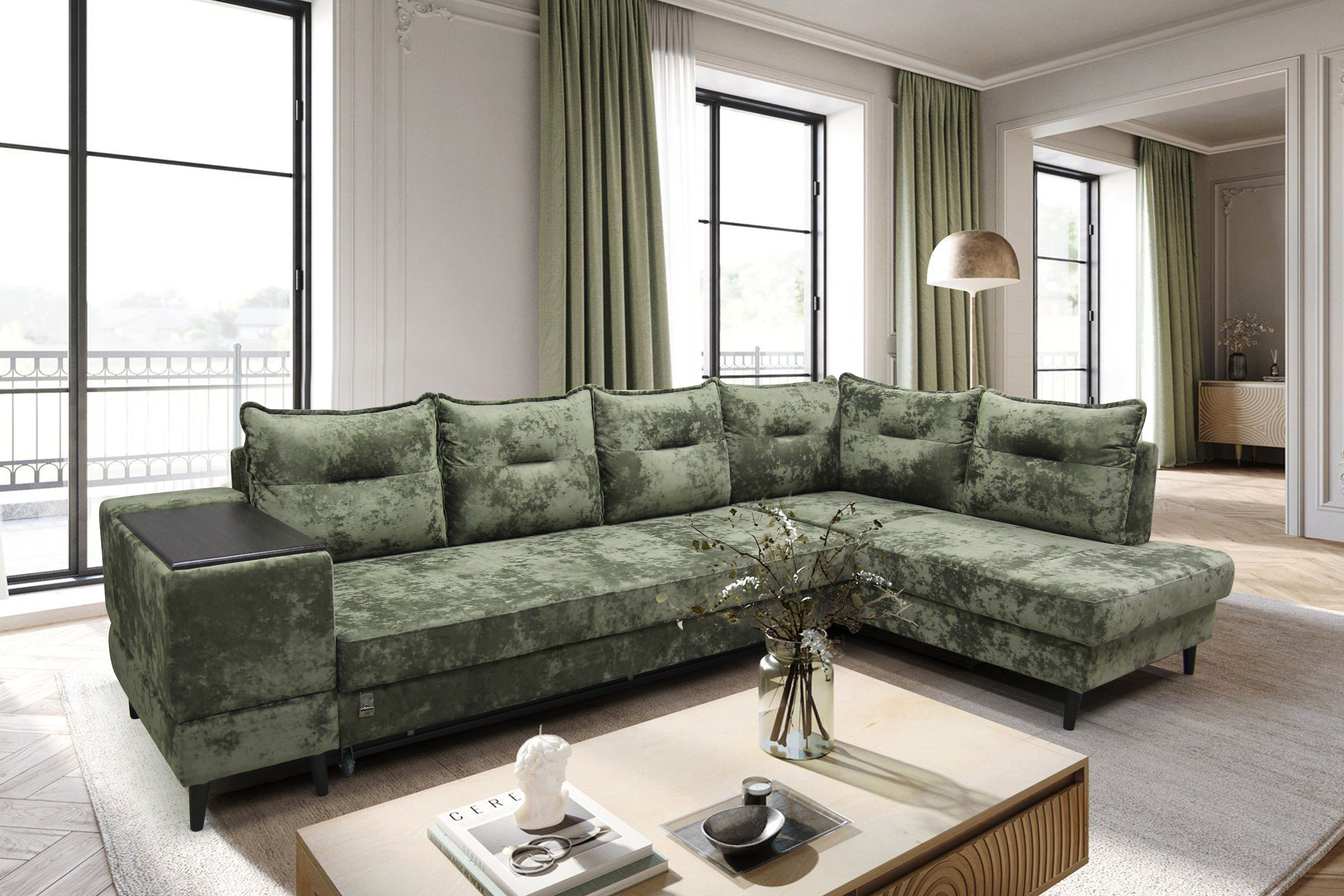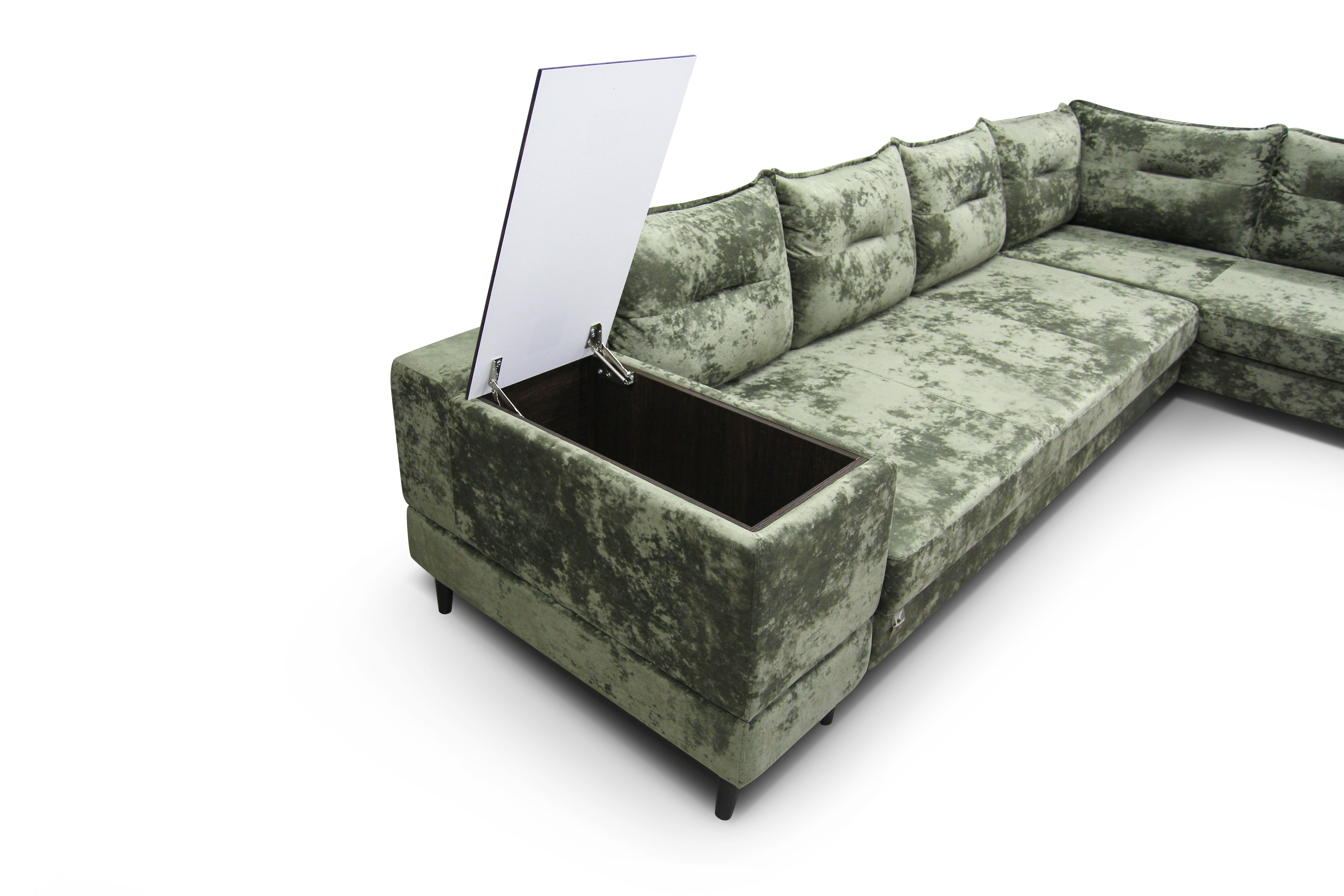 Диван Софи установлен на высокие устойчивые деревянные ножки, высоты достаточно для комфортной самостоятельной уборки или с помощью робота-пылесоса.