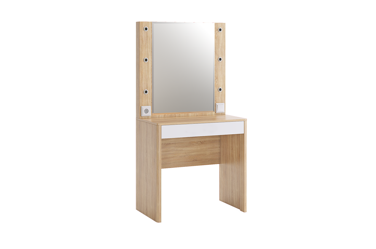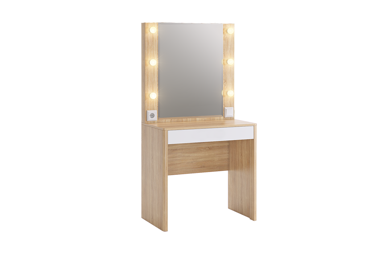 Трюмо Зара — это идеальное сочетание стиля и практичности. С широким фацетированным зеркалом, в котором встроена подсветка из 6 лампочек, оно создает атмосферу профессиональных студий визажистов прямо у вас дома. Комфорт и функциональность обеспечиваются дополнительными элементами, такими как выключатель, розетка для фена и выдвижной ящик для хранения украшений и косметики. Элегантные закругленные углы завершают дизайн, делая его идеальным дополнением к вашей спальне.